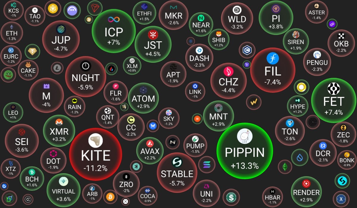 🗓 11.03.2026 09:30 по Москве. 🔗 Посмотреть на сайте 📈 Лидеры роста (из ТОП-100): 🟢 pippin (PIPPIN): $0.4157 (+13.3%) 🟢 ASI Alliance (FET): $0.1567 (+7.4%) 🟢 Internet Computer (ICP): $2.6548 (+7%) 📉 Лидеры падения (из ТОП-100): 🔴 Kite (KITE): $0.2672 (-11.2%) 🔴 Filecoin (FIL): $0.8598 (-7.4%) 🔴 Midnight (NIGHT): $0.0524 (-5.9%) 🔍 Основные метрики: 🔴 Общая капитализация: $2375.09 млрд (-0.38%) 🟢 Общий объем торгов: $111.11 млрд (+5.92%) 🔴 Доминация Bitcoin: 58.77% (-0.08%) 🔴 Доминация Ethereum: 10.26% (-0.11%) 🟢 Индекс страха и жадности: 15 / 100: ЭКСТРЕМАЛЬНЫЙ СТРАХ (+2) ⚪️ Индекс Альтсезона: 36 / 100: НЕ АЛЬТКОИН-СЕЗОН (0) 📖 Интересно почитать: 👉 Garda Wallet: оплата криптовалютой по QR, новый конкурент Antarctic Wallet и Cashinout 😻 Наши сервисы и бонусы: 🫧 Coinbubbles.ru - наглядная визуализация рынка криптовалют в виде пузырей 📈 Gate - 20% скидка на комиссии при торговле на споте и фьючерсах