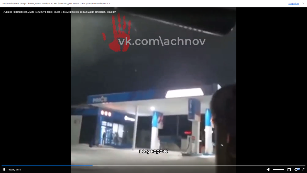 Маме ребенка-инвалида не заправили машину. В такой нервной ситуации оказалась подписчица АЧН. По ее словам, сотрудник газовой заправки сказал, что ребенку нужно выйти из машины. Но, поскольку девочка передвигается на коляске, а на улице был сильный мороз, мама попросила его так заправить транспорт. Тогда мужчина попросил разрешения у оператора. Вероятно, в целях безопасности. Ответ был положительным, но почему-то он все равно оставил семью без топлива. Местной жительнице стало очень обидно. Она позвонила в полицию, но не успела дождаться сотрудников, поскольку уже было поздно.