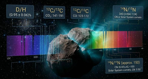 Химия атомов рассказывает истории о происхождении космоса. В нашей Солнечной системе изотопы элементов сохраняют постоянные пропорции, действуя как отпечаток пальца, идентифицирующий все тела, рожденные из одного и того же исходного газового облака. Однако межзвездный объект 3I/ATLAS только что разрушил эту схему, продемонстрировав никогда ранее не виданную химическую сигнатуру.
