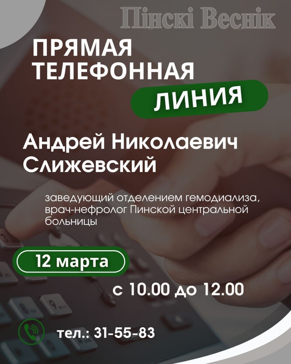 ! 📌В рамках Дня почки 12 марта на горячих линиях дежурят следующие специалисты: 🟦Андрей Николаевич Слижевский, заведующий отделением гемодиализа, врач-нефролог Пинской центральной больницы (тел.: 31-55-83) - с 10.00 до 12.00; 🟦София Иосифовна Ягело, заместитель заведующего детской поликлиникой (тел.: 63-65-10) - с 12.30 до 13.30; 🟦 Светлана Александровна Ермоленко, врач по медицинской профилактике, заведующий отделом общественного здоровья и СГМ Пинского зонального центра гигиены и эпидемиологии (тел.: 65-98-11) - с 14.00 до 15.00. @Пинский Вестник 📱Ютуб 📱ВК 📱ИНСТАГРАМ 📱ОК 📱ФЕЙСБУК 📱ТИК ТОК Прислать новость