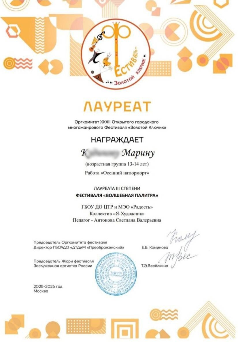 ! 8 «Е» класс входит в городской проект «Естественно-научная вертикаль». Учеба в нем предполагает углубленное изучение биологии, химии и физики в урочной и внеурочной деятельности. Но в этом классе есть обучающиеся, которые имеют таланты и в других направлениях. Хочется отметить Марину К. — воспитанницу художественной школы «Радость». Марина стала лауреатом III степени фестиваля «Волшебная палитра», который проходил в рамках ХХХII Открытого городского многожанрового фестиваля «Городской ключик». Её работа «Осенний натюрморт» была высоко оценена профессиональным жюри. ⭐ Поздравляем Марину с достижением и желаем дальнейших успехов и в науке, и в живописи! ✅ Подписывайтесь на ГБОУ Школа №185 в МАХ #ДОНМ #ТалантливыеДетиМосквы #ШколыКолледжиМосквы #Школа185 #САО