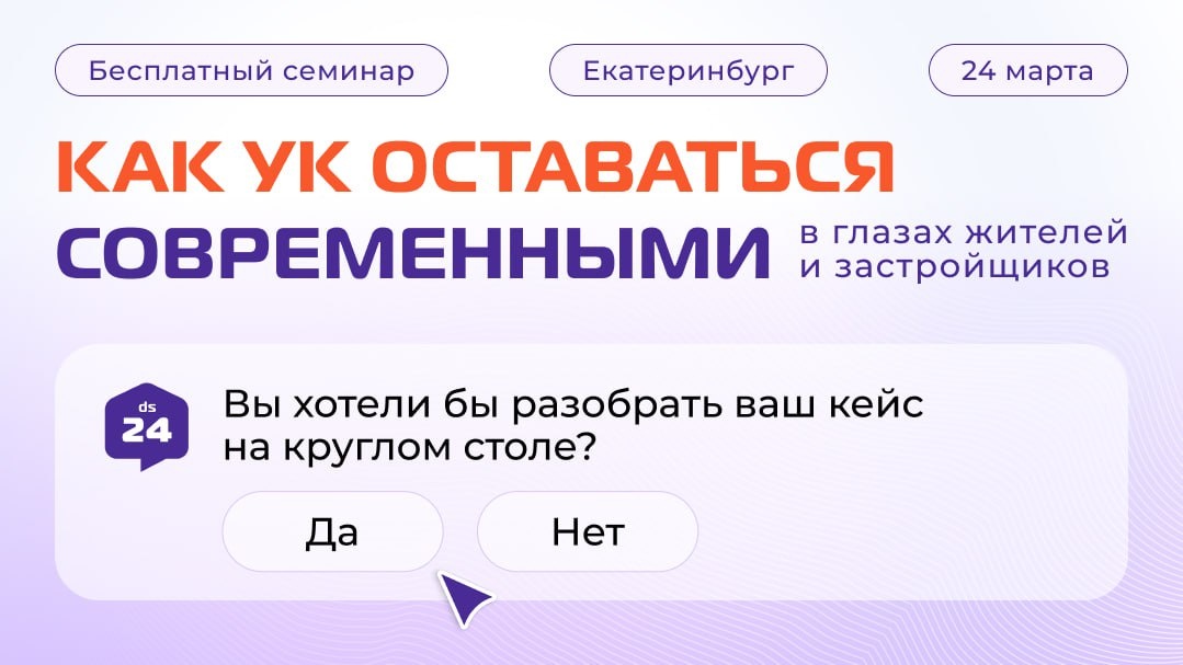 Уже совсем скоро пройдёт большой семинар для руководителей УК. Соберёмся с вами офлайн, чтобы поговорить на тему: «Как УК оставаться современной — цифровые инструменты для роста качества услуг, лояльности жителей и прибыли компании». Напомним пароли и явки: 🔹 24 марта (вторник) 🔹 Екатеринбург, отель Marins 🔹 начало в 10.00 (время местное) 🔥 Участие бесплатное 🔥 Но обязательно зарегистрируйтесь, чтобы вам хватило места в зале: 👉 https://clck.ru/3SUHya О программе и наших спикерах подробно рассказывали выше, а сегодня хотим предложить вам поучаствовать в круглом столе. Он пройдёт в конце семинара. 💫 Круглый стол — это открытая дискуссия всех участников семинара под модерацией экспертов. Будем вместе разбирать реальные кейсы — рабочие задачи и вопросы руководителей УК. Участие в круглом столе — отличная возможность получить новое видение по вашему вопросу. Вы сможете посоветоваться с экспертами и участниками рынка, найти оптимальное решение и формат работы. ✍️ Чтобы ваш вопро