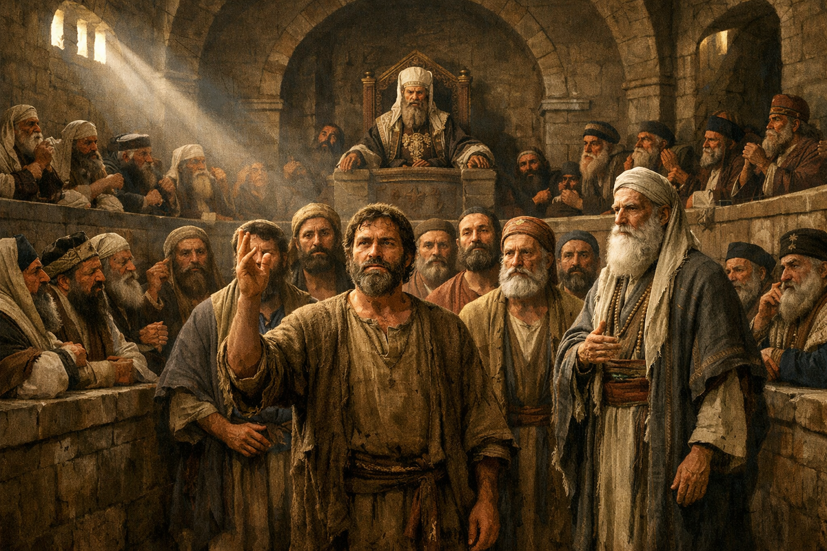 Апостолов снова ввели в тот же зал синедриона. Их лица были полны достоинства, а походка говорила о непоколебимой вере. Первосвященник поднялся и с ненавистью посмотрел на апостолов. — Разве мы не запретили вам учить о том имени? — спросил он, его голос дрожал от напряжения. — Вы же наполнили Иерусалим своим учением и хотите навлечь на нас кровь Того Человека. Он избегал называть Иисуса по имени, видя в нём лишь «Того Человека» — мёртвого, которого следовало забыть. В зале повисла тишина. Все взгляды были прикованы к апостолам. Пётр сделал шаг вперёд. Слова сами собой срывались с его губ. — должно повиноваться больше Богу, нежели человекам, — произнёс он твёрдо. Его голос звучал спокойно, но в нём чувствовалась сила, способная потрясти даже стены. — Бог воскресил Иисуса, которого вы убили, — продолжал Пётр. — Он вознёс Его на небеса, чтобы даровать Израилю покаяние и прощение грехов. Мы и Святой Дух — свидетели этого. Зал взорвался криками. Судьи вскочили, требуя немедленной расправы.