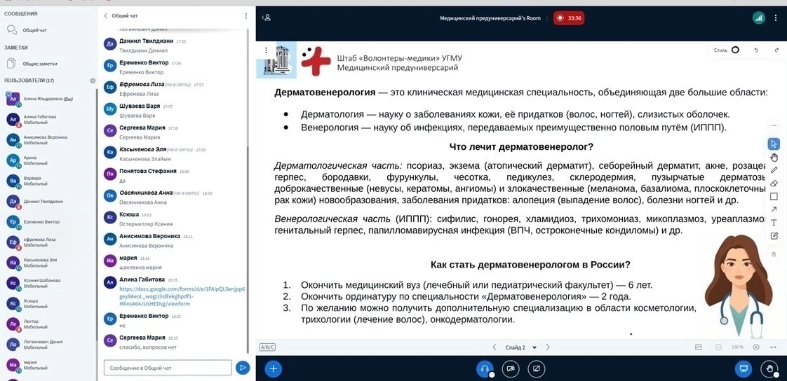 Выбор профессии врача начинается задолго до поступления в медицинский университет. Чтобы помочь школьникам лучше понять специфику будущей профессии, в Уральском государственном медицинском университете реализуется образовательный курс «Медицинская диагностика: действуем вместе». Проект направлен на раннюю профориентацию и знакомство будущих абитуриентов с основами медицинской диагностики. В течение февраля участники штаба «Волонтёры-медики» УГМУ провели серию лекций для учеников 10-х классов школ Свердловской области. Программа была разработана медицинским предуниверсарием УГМУ и реализована при методической поддержке волонтёров. На занятиях участники познакомились с диагностикой распространённых заболеваний и различными направлениями медицины. Школьники изучали основы: — хирургии (язва желудка, острый аппендицит)