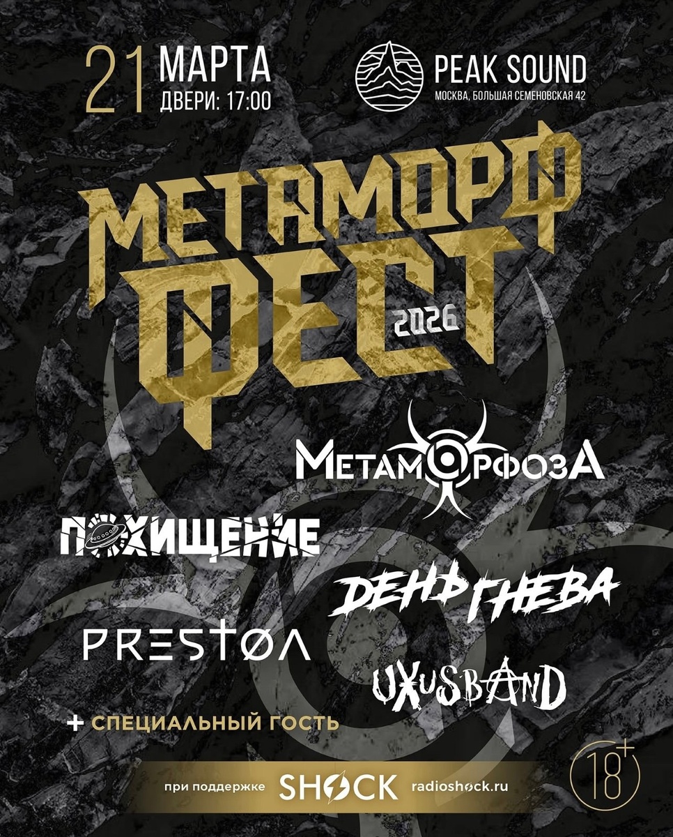 , 21 марта, состоится фестиваль, в котором примем участие мы и наши лучшие хиты! Для всех, кто желает попасть на фест совершенно БЕСПЛАТНО и отлично провести субботний вечер, есть такая возможность! Первые 5 человек, которые поставят + в комментариях под постом до 20 марта, гарантированно получат проходку на концерт бесплатно! Не упусти свой шанс! Ждём всех! 21 марта Клуб Peak Sound МетаморфФест Начало: 17:00 Адрес: Большая Семёновская улица 42. стр. 3, Москва.