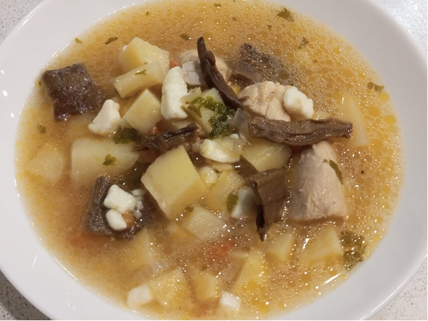 Ингредиенты: - филе куриное – 450-500 гр.; - картофель – 3-4 средние штуки; - репчатый лук – 1 шт.; - морковь – 1 шт. по желанию; - сушеные грибы – горсть, 20 гр.; - сыр плавленый Дружба – 4 штуки по 70 гр.; - зелень петрушки – по вкусу; - соль – по вкусу; - перец черный молотый – по вкусу; - вода – 3-3,5 литра. Грибы замочить в 0,5 литрах кипятка на 10-15 минут. В кастрюлю с водой добавить нарезанный картофель, нарезанное филе курицы, довести до кипения, снять пенку или для того чтобы не снимать пенку курицу и картофель добавить в уже закипевшую воду. При использовании моркови, морковь очистить, промыть, нарезать мелким кубиком (в этот суп морковь, натертая на терке, не подойдет), лук очистить, мелко нарезать, обжарить вместе с морковью на растительном масле. Картофель с курицей проварить около 5 минут. Замоченные грибы перемешать, аккуратно снять с поверхности чтобы не попал осевший песок, добавить к курице с картофелем, воду от замоченных грибов добавить в кастрюлю без осадка, добав