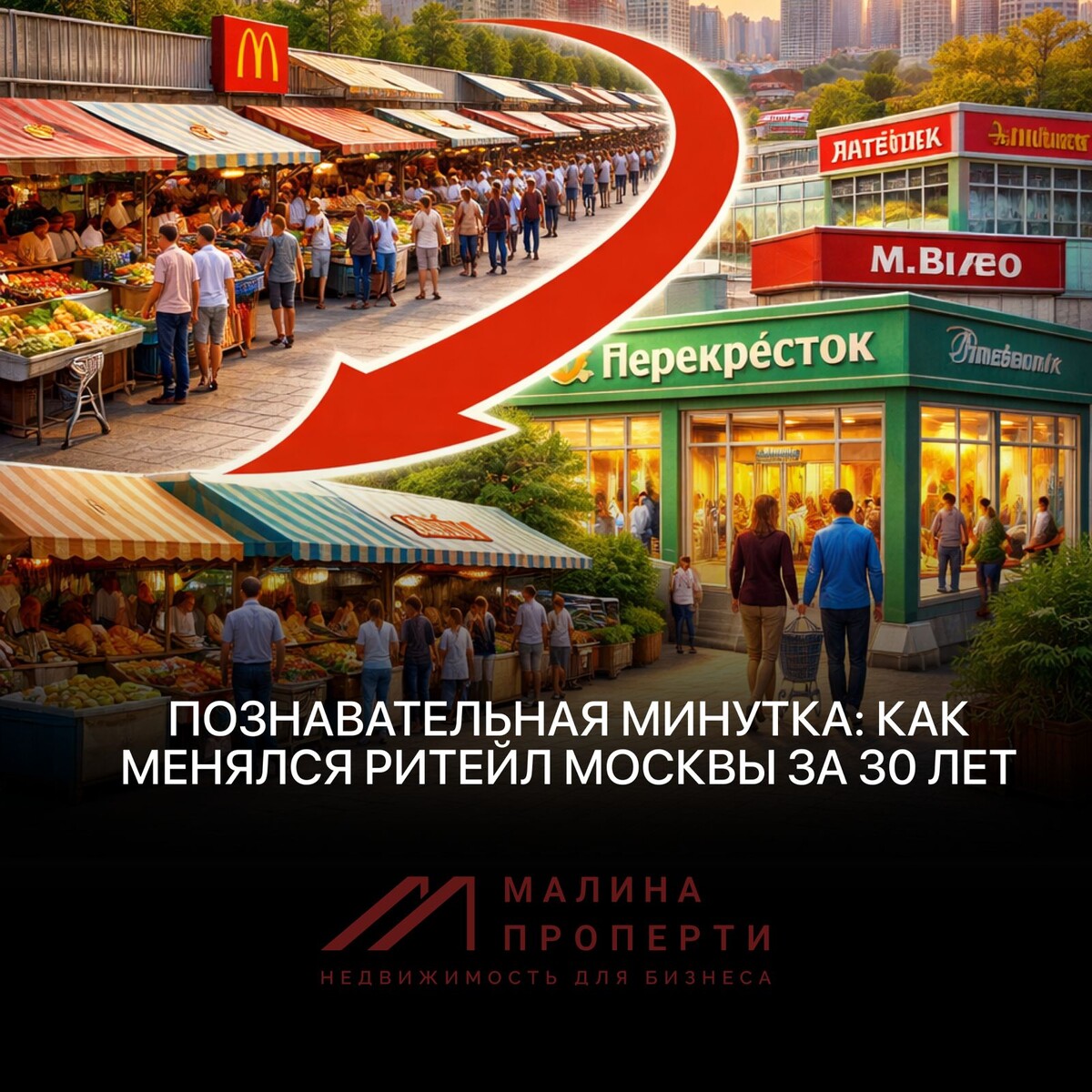 Если коротко: московский ритейл за 30 лет прошёл путь от палаток до маркетплейсов. И каждый этап определяли свои якорные арендаторы улиц. 1990–1995. Рынки и ларьки В начале 90-х нормальной системы ритейла в Москве практически не было. Советская торговля распалась, новая ещё не сформировалась. Город торговал как мог. Главными центрами торговли стали рынки: — Черкизовский — Лужники — Дорогомиловский Вокруг них формировались целые торговые кластеры. На улицах доминировали киоски: сигареты, кассеты, импортная одежда, бытовая мелочь. Якорь улицы тогда выглядел просто — рынок или гастроном. Символ новой эпохи появился 31 января 1990 года — открытие первого McDonald's на Пушкинской площади. Очередь растянулась на тысячи людей. Для москвичей это был первый опыт западного потребления. Параллельно продолжали работать советские гастрономы. Самый известный — Елисеевский на Тверской. Типичные арендаторы улиц того времени: — ларьки — рынки — кооперативные магазины — палатки с импортными товарами Эт
