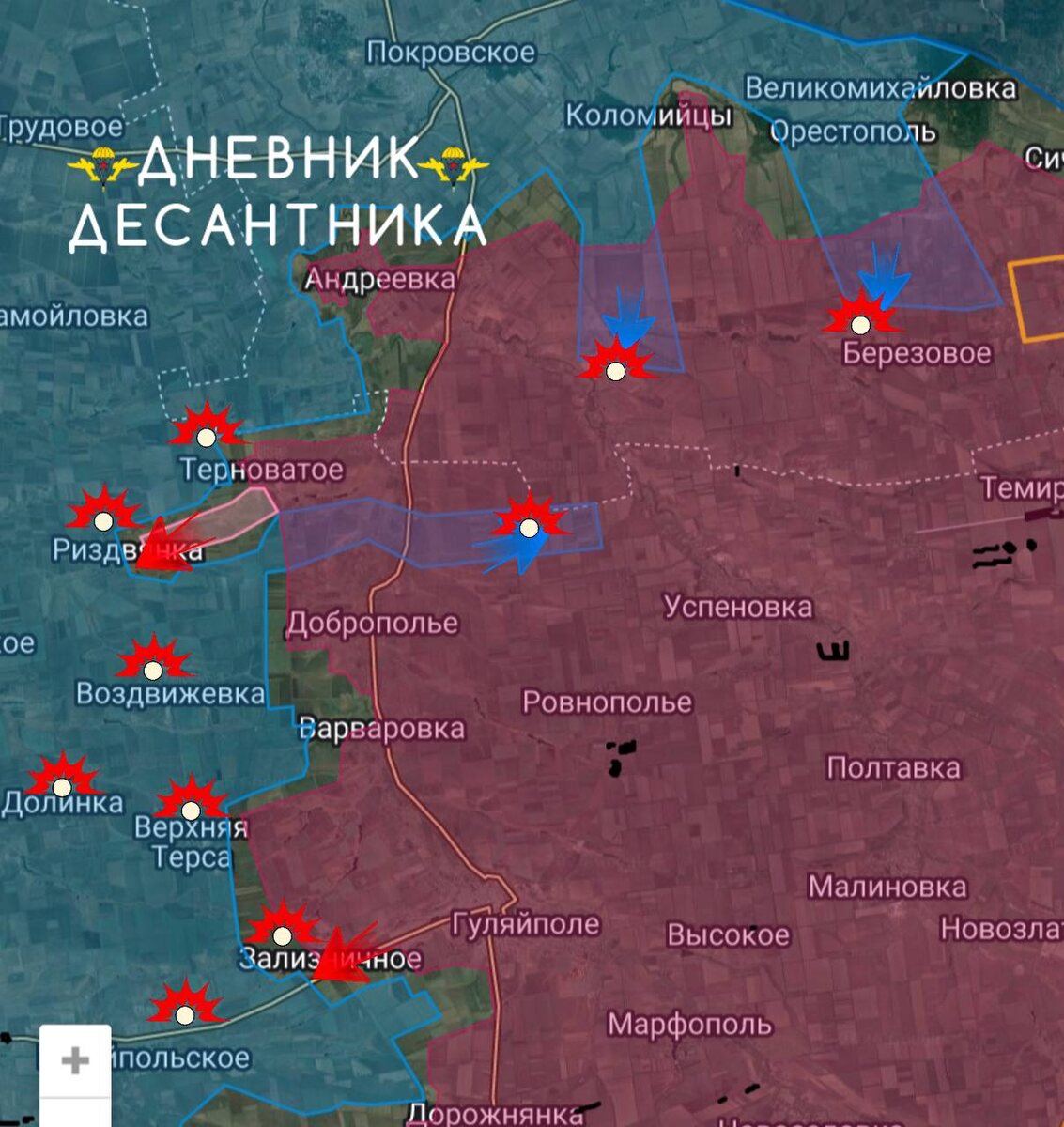 ▫️Участок Гуляйполя. ▫️Западнее Даниловки идут бои за прибрежье реки Янчур, противник контратакует, но закрепиться им не удается, активно работают наши операторы дронов по вражеским группам. ▫️Южнее Новоалександровки также фиксируются заходы малых групп ВСУ, которые рассредоточены по до Вишневого. Но ни налаженной логистики, нечеткого закрепления на позициях противник не достиг, тем самым, заявлять о контроле данной территории за ВСУ невозможно. ▫️Такая же обстановка и от Соснового до Берёзового. ▫️А у Риздвянки наша армия продвинулась вперед, вернув контроль над дорогой Терноватое-Придорожное-Риздвянка. Ранее, противник используя эту логистическую артерию, провел накаты на бронетехнике и спешил пехоту, которая группами прошла до Рыбного. Теперь же, восстановив контроль над этим участком, ВСУ утратили возможность снабжения и ротации своих брошенных на убой побратЫмов. ▫️У Зализничного идут позиционные бои, как и у Белогорья. Наши войска наносят удары по технике противника по дорог