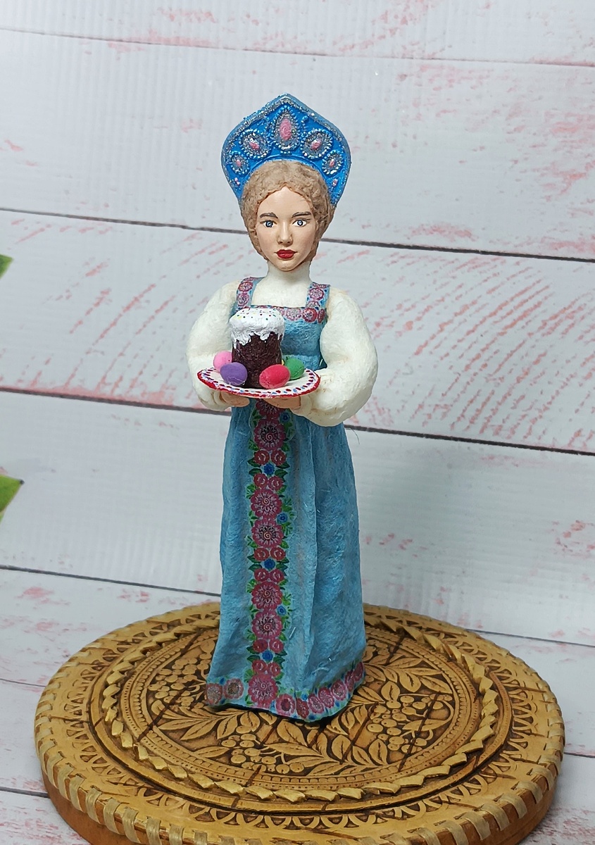 Познакомьтесь с моей новой девочкой - русской красавицей с пасхальным угощением! Высота куколки - 15 см. Устойчивая, но рекомендую для верности использовать подставку. Петельку-подвес не стала вкручивать, поскольку тематические пасхальные куколки редко вешаются на ёлку. Но при желании, подвес легко добавить.