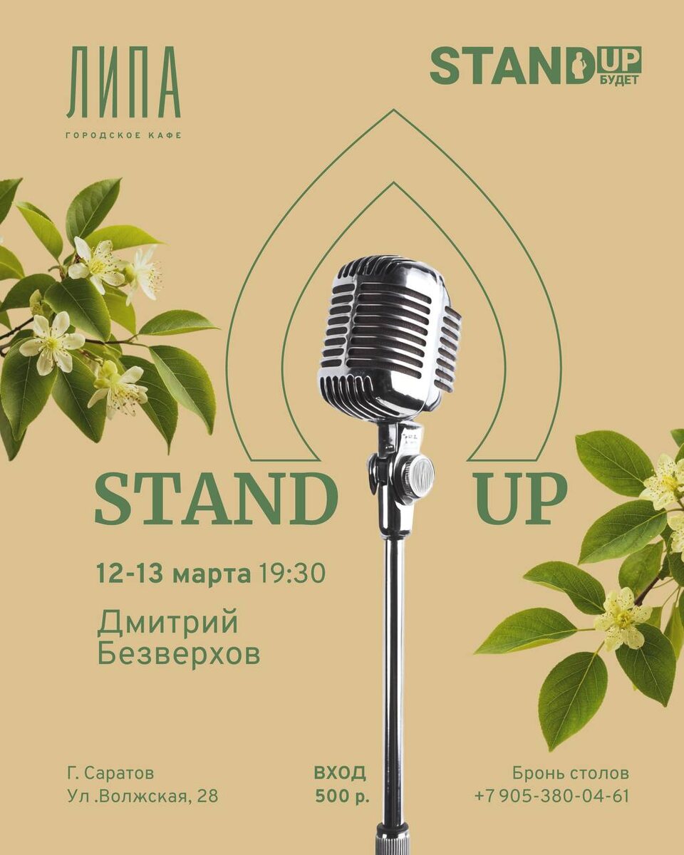 🎤✨ 12 марта приглашаем вас на вечер Stand Up. Забываем про рабочие дедлайны, заказываем любимый ужин и настраиваемся на волну юмора. Лучший способ разрядить будни — это посмеяться над жизненными историями в уютной компании. 🥗 Пробуем новинки меню, пьем кофе (или что-то покрепче) и наслаждаемся качественным юмором. 🗓 Когда: 12.03 (четверг) 🕕 Время: 19:30 🎟 Вход: 500₽ Бронь столов: +79962044949