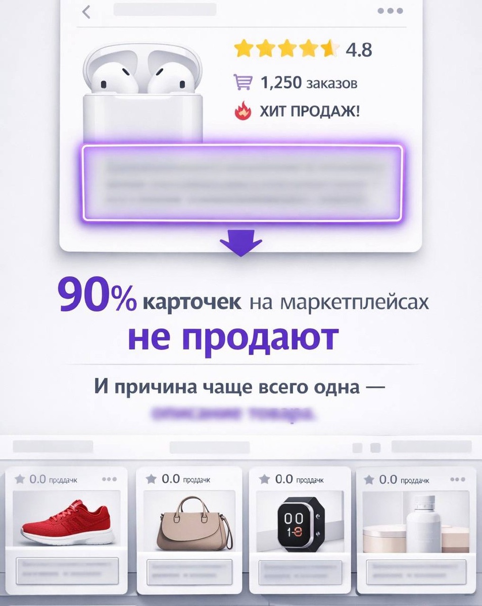И причина чаще всего одна — описание товара. Большинство продавцов пишут его для галочки. Пара сухих предложений — и готово. Но на самом деле описание — это ваш невидимый менеджер по продажам. И если он работает плохо — вы просто сливаете трафик. Проверьте свою карточку по простому чек-листу: 🟣 Есть структура — заголовки, абзацы, списки? 🟣 Живой язык — без сухого канцелярита? 🟣 Ясна выгода — клиент понимает, зачем ему товар? 🟣 Отработаны возражения — «а вдруг не подойдёт», «а если брак»? 🟣 Стиль подходит под категорию и аудиторию? 🟣 Понятно, для кого товар — клиент узнаёт себя? 🟣 После прочтения самому хочется купить? Если хотя бы 2–3 пункта проседают — описание не продаёт. Если честно, большинство продавцов просто не умеют писать продающие карточки. На нашем мини курсе для менеджеров маркетплейсов мы отдельно разбираем: — SEO карточки товара — структуру продающего описания — как писать тексты, которые реально повышают продажи — и как через это находить клиентов на соп