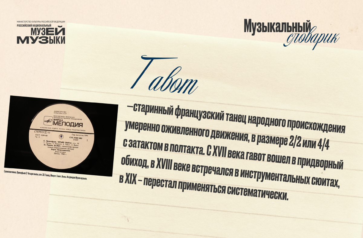 В рамках рубрики «Музыкальный словарик» сегодня разбираем термин «гавот». Гавот (фр. gavotte, от провансальск, gavoto) — старинный французский танец народного происхождения умеренно оживленного движения, в размере 2/2 или 4/4 (по сути, это одно и то же) с затактом в полтакта. С XVII века гавот вошел в придворный обиход, в ХѴІII веке встречался в инструментальных сюитах, в ХІХ перестал применяться систематически. В XX веке композиторы вспомнили о, казалось бы, навсегда забытом танце. Новое столетие «смотрело» в прошлое, в эпоху Барокко. И ритмы старинных танцев отлично сочетались с современным языком. Одним из самых больших любителей гавота был Сергей Прокофьев: вспомним его чудесный Гавот из Первой («Классической») симфонии, фрагмент которого через много лет вошёл в балет «Ромео и Джульетта». Или — Гавот из цикла «Десять пьес для фортепиано", ор.12».