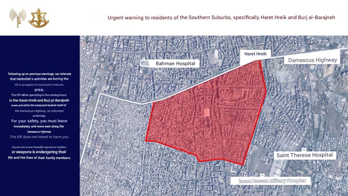 ⚡️ IDF issues an urgent evacuation warning for residents of Haret Hreik and Burj al-Barajneh in Dahiyeh, Beirut’s southern suburbs