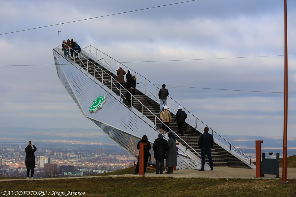Хотите объять взглядом сразу весь Грозный? Плюс увидеть другой ракурс чем со смотровой площадки Грозный-Сити, тогда вам на смотровую «Лестница в небо». В небо без всякой видимой опоры устремлена лестница с зеркальной поверхностью, в которой отражаются мигающие огни города. А поднявшись наверх - весь город, как на ладони. Смотровая площадка «Лестница в Небеса» расположена у поселка Орци-Мохк на окраине Грозного. С чеченского название переводится как «родина Орци»: поселок назван в честь известного чеченца, генерала царской армии Орцу Чермоева. Лестницу начали возводить в середине июля 2019 года, а 5 октября, в День Грозного, объект был сдан. Отдаленным прообразом одной из популярнейших локаций города послужила лестница в бельгийской коммуне Тилт-Винге, однако стояла задача «вписать» 30-метровую конструкцию в окружающий пейзаж, не нарушая природной гармонии. В итоге было решено использовать для облицовки зеркальные листы из нержавеющей стали. Основные работы производились на заводе «Тепл