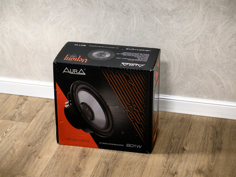 Всем привет! Сегодня познакомимся с сабвуфером, да не простым, а SQ. Моё внимание привлекла модель AurA Venom‑HD12 — как сабвуфер, ориентированный не на громкость, а на качество баса. Разберём, какие впечатления оставляет устройство на этапе знакомства с ним. Нас встречает яркая и стильная коробка. На обратной стороне расположились основные характеристики и установочные размеры, давайте взглянем на них. Номинальная мощность 301 Вт — не рекордная, но достаточная для качественного баса в SQ‑системах. Интересно придумали, 301 Вт, видимо, дело рук маркетологов, и это работает, внимание однозначно привлекает) Импеданс 2+2 Ом даёт гибкость при подборе усилителя: можно подключить в 1 Ом для большей мощности или в 4 Ом для более стабильного режима работы. Параметры Тиля‑Смолла присутствуют — это важно для тех, кто планирует точный расчёт акустического оформления. Хочу отдельно отметить, что к разработке приложил руки сам Александр Лысенко, очень известный человек в области автозвука, это сразу