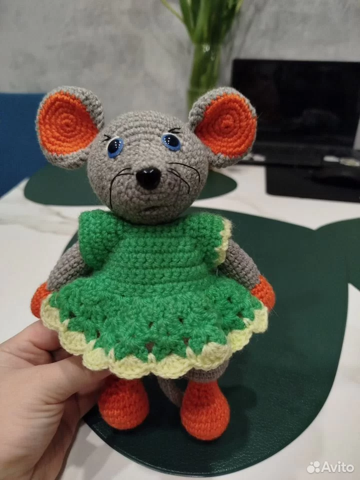 Дорогие ценители мягких игрушек и мастера ручной работы! Представляю вашему вниманию уникальное изделие — очаровательную мягкую игрушку в виде мыши, созданную от души и с огромной теплотой. Это не просто обычная игрушка, а настоящее художественное произведение, выполненное вручную крючком. Каждая петелька и каждый стежок сделан с большой любовью и вниманием, благодаря чему игрушка приобретает особую индивидуальность и неповторимый шарм. Изготовлена эта волшебная мышка из высококачественной акриловой пряжи, которая известна своей приятной мягкостью и прочностью. Материал отличается гипоаллергенностью и абсолютно безопасен даже для чувствительной детской кожи. Именно поэтому такую игрушку смело можно дарить нашим любимым малышам. Наполнитель игрушки — мягкий и легкий синтепон, который отлично сохраняет свою форму. Благодаря этому материалу игрушка получается объемной, легкой и приятно ощущается в руках ребенка. Отсутствие тяжелых деталей позволяет легко держать игрушку даже самым маленьк