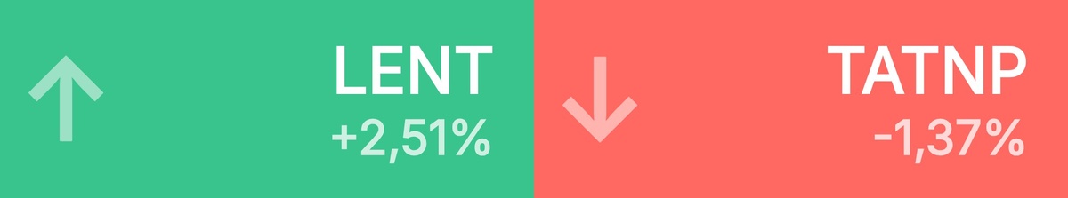 : Лента • 2 182 ₽ • 2,51% Группа Поз • 1 226 ₽ • 1,34% Русал • 45,00 ₽ • 1,28% АФК Систем • 13,63 ₽ • 1,06% Эн+ • 509 ₽ • 0,92% Совкомбанк • 13,86 ₽ • 0,91% Медикал Гр • 1 447 ₽ • 0,88% Норильский • 158 ₽ • 0,78% РусГидро • 0,46 ₽ • 0,77% ЮМГ • 856 ₽ • 0,68% 🔻 Топ-10 лидеров падения среди крупнейших акций: Татнефть п • 584 ₽ • -1,37% РуссНефть • 140 ₽ • -1,34% Совкомфлот • 85,25 ₽ • -1,30% Роснефть • 479 ₽ • -1,19% Татнефть • 627 ₽ • -1,14% Лукойл • 5 672 ₽ • -0,69% ЭЛ5-Энерго • 0,51 ₽ • -0,59% Полюс • 2 452 ₽ • -0,50% Циан • 605 ₽ • -0,46% Мечел • 72,95 ₽ • -0,42%
