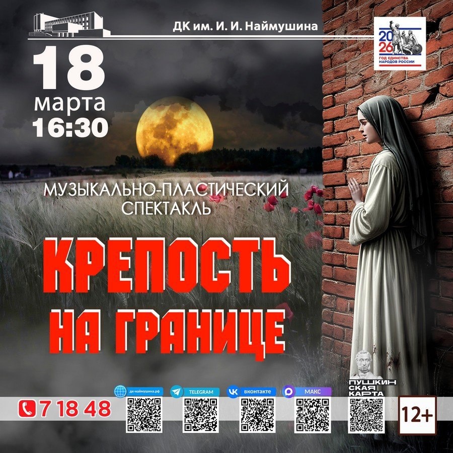 ! 18 марта в 16 ч. 30 мин. во Дворце культуры имени И. И. Наймушина Это история, литература… В таких спектаклях твоих современников ты познаёшь смыслы. Твой урок мужества! 18 марта в 16.30 Концертный зал Билеты в кассе ДК, на сайте https://center-kino.ru/221/release/10069809?date=2026-03-18 Пушкинская карта