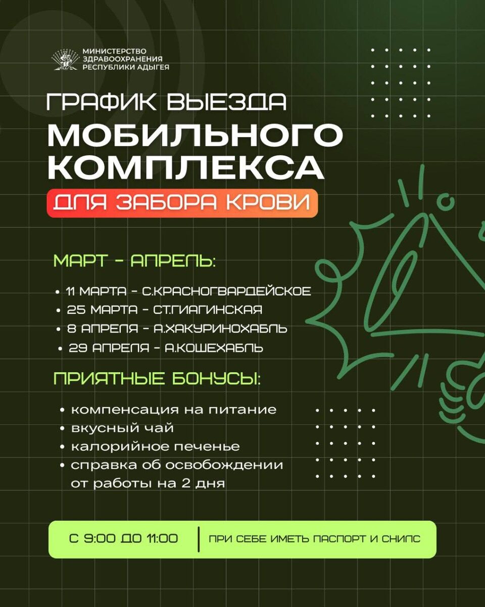 Приглашаем всех желающих совершить донацию в мобильной станции в соответствии с графиком. Смотрите карточку 💬 📍Дополнительная информация по телефону: 📲 +7(961)854 89 09 💬Минздрав Адыгеи в МАХ