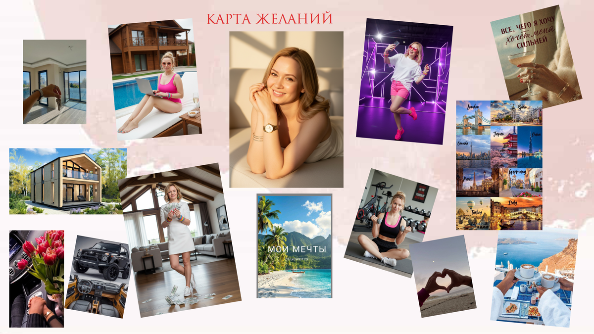 Потом начался самый кайф — поиск картинок! Я рылась в журналах, скриншотила интерьеры, находила фото гор, которые хочется покорить, и кафе, где хочется завтракать каждое утро. В какой‑то момент мой стол напоминал штаб секретной операции: вырезки разложены по стопкам, клей на пальцах, глаза горят энтузиазмом.