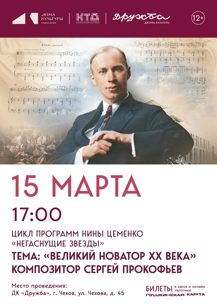 ✨ Авторская программа Нины Цеменко «Негаснущие звезды», посвящённую композитору XX века — Сергею Прокофьеву В этот вечер вы услышите увлекательный рассказ о его творчество, экспериментах, яркой судьбе и бессмертных произведениях, которые и сегодня звучат. 👉Особенно радостная новость для обладателей Пушкинской карты: вы можете использовать ее для покупки билета - https://iframeab-pre11724.intickets.ru/seance/69833331/#abiframe 🚫 Возраст: 12+ 📆 15.03.2026 🕛 17:00 🏢 ДК «Дружба» 📍 г. Чехов, ул. Чехова, д.45 💰 Цена: 200 ₽ ⭐Поддержать канал голосом ✅ Мероприятия Чехов https://dzen.ru/id/66cc4b48e9ef144699238a51 https://vk.ru/chekhov_events http://dzen.ru/chekhov_events