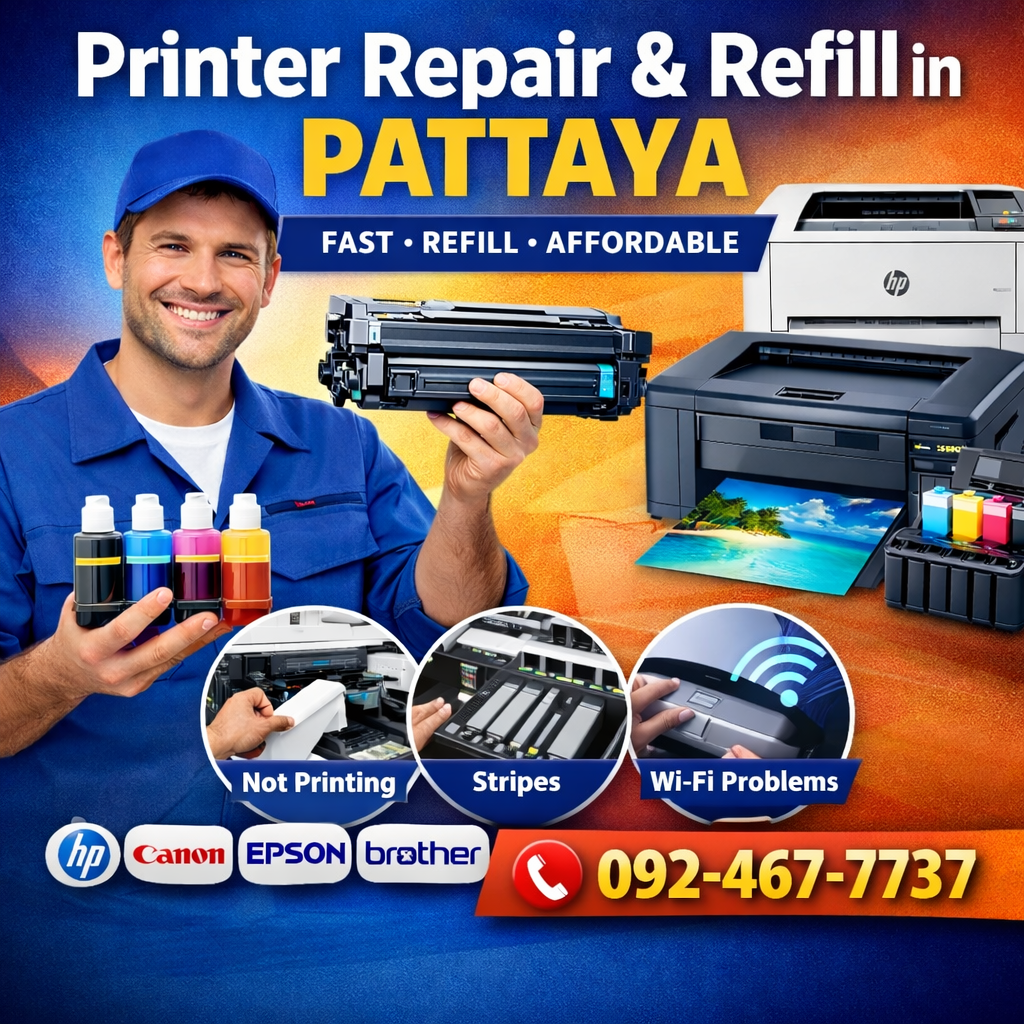 Принтер — это техника, без которой сложно представить работу офиса, магазина или даже дома. Когда принтер внезапно перестает печатать, начинает печатать полосами или показывает ошибку картриджа, многие думают о покупке нового устройства. Но в большинстве случаев принтер можно быстро и недорого восстановить, если обратиться к специалистам по ремонту и обслуживанию принтеров. Мы выполняем ремонт принтеров в Паттайе, а также профессиональную заправку картриджей, обслуживание и настройку принтеров для частных клиентов, компаний и офисов. Работаем со всеми популярными брендами печатающей техники: HP