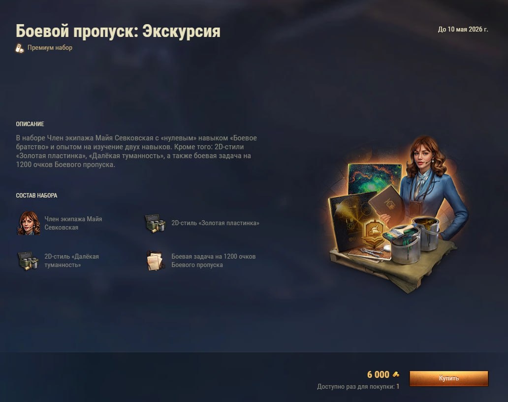 Кстати, во внутриигровом магазине можно приобрести за 💰вот такой пакет c членом экипажа Майей Севковской, боевой задачей на 1200 очков ПБ и