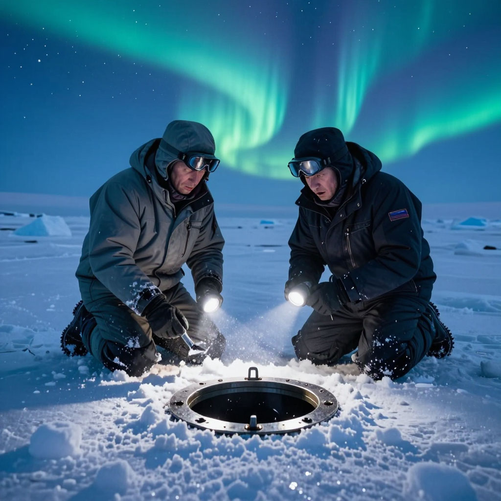 Всё началось с того, что Воронов, возвращаясь с замеров, заметил на льду тёмное пятно — идеально круглое, диаметром около двух метров. Он позвал Рябинина, и они вместе расчистили снег. Под ним оказался металлический люк — гладкий, без видимых швов, с едва заметной кольцевой линией по краю. Металл был холодным, но не ледяным, и странно матовым — свет от фонарика не отражался, а будто поглощался.