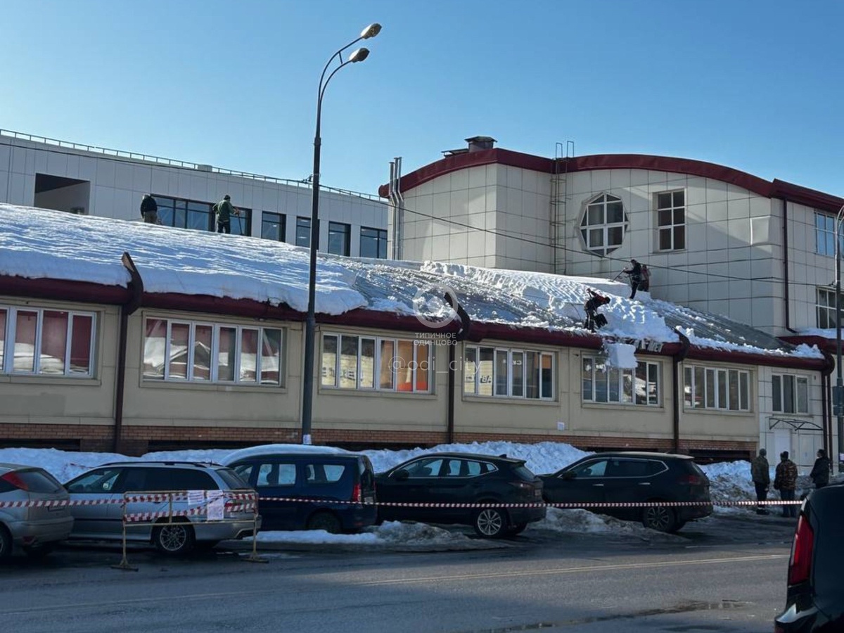 На улице Говорова решили не дожидаться беды и начали счищать снег с крыши над магазином «Лента»