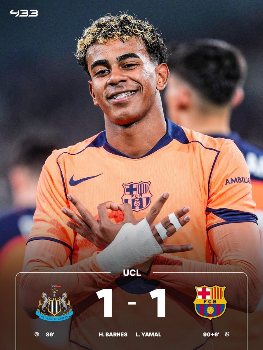В первом матче 1/8 финала Лиги Чемпионов с «Ньюкаслом» 18-летний испанец хладнокровно реализовал 11-метровый. В момент гола Ламина Ямаля на табло было зафиксировано время 95:50 – это самый поздний мяч «Барселоны» с пенальти за всю историю выступлений в Лиге Чемпионов. ⚽️ Подписывайтесь на нас в MAX
