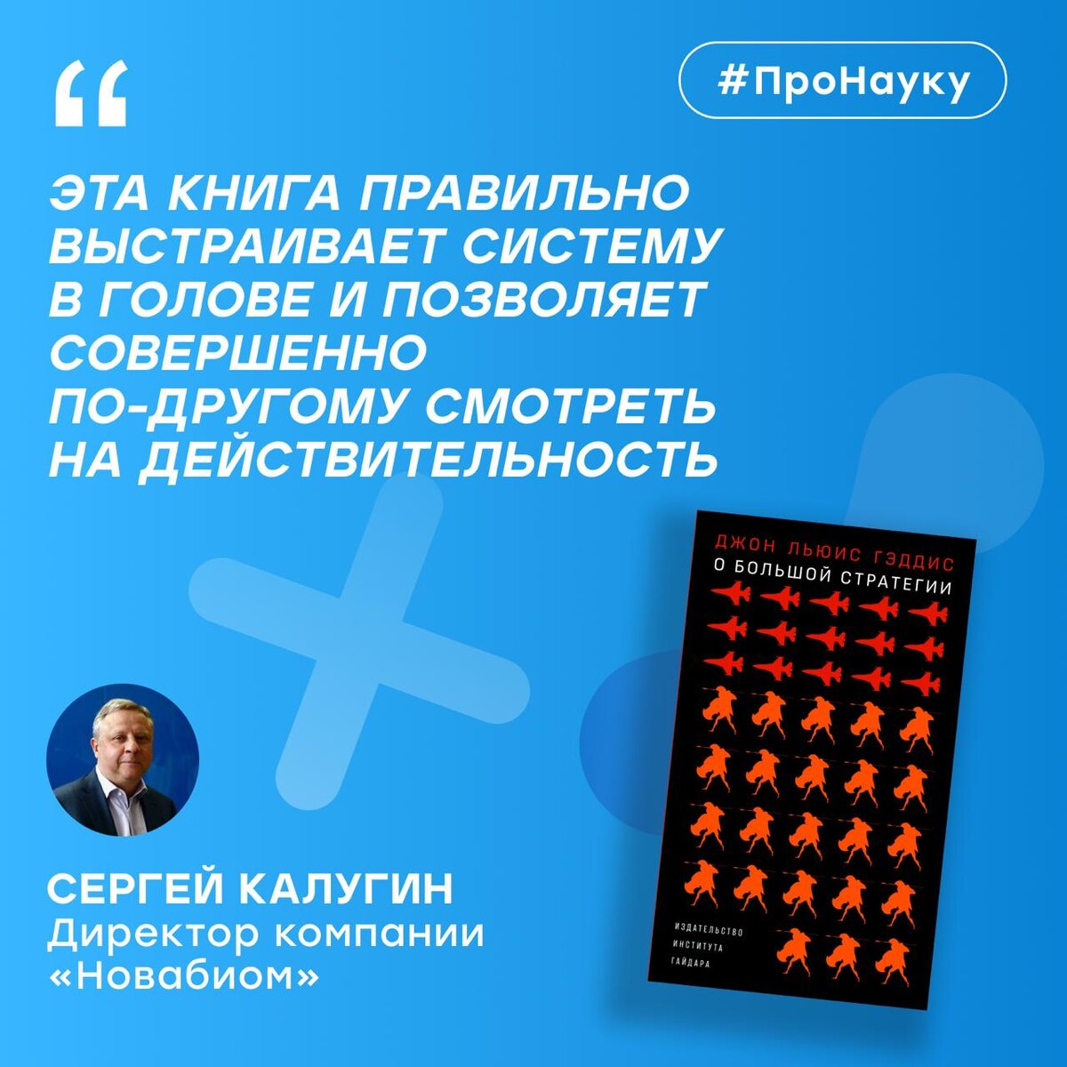 По традиции делимся книжными рекомендациями гостей подкаста #ПроНауку. На этот раз – выбор Сергея Калугина, сооснователя и генерального директора компании-резидента «Новабиом». Он советует книгу, которая помогает смотреть на стратегию не в горизонте ближайших лет, а на десятилетия вперёд. 🔹 «О большой стратегии», Джон Льюис Гэддис Автор, профессор военной истории, анализирует решения лидеров разных эпох и отмечает: одной амбициозной цели недостаточно – важно уметь соотносить её с реальностью, сложной, противоречивой и постоянно меняющейся. «В книге много исторических примеров. Один из них связан с Авраамом Линкольном: стремясь к отмене рабства, он принимал достаточно спорные решения. Когда его спрашивали, как это сочетается с высокой целью, Линкольн отвечал, что по профессии он землемер: если между двумя точками лежит болото, пройти по прямой невозможно», – рассказывает Сергей. Эта метафора хорошо показывает: путь к большой цели редко бывает прямым. Стратегическое мышление требуе