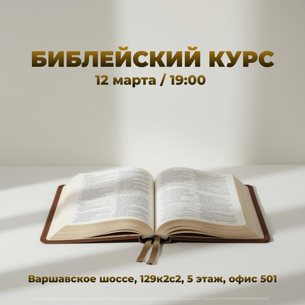 12 марта / 19:00 / Варшавское шоссе, 129к2с2, 5 этаж, офис 501 «Блаженны слышащие слово Божие и соблюдающие его» (Луки 11:28). Изучение Библии открывает нам Божью мудрость и помогает лучше понять Его волю для нашей жизни. До встречи 🤎