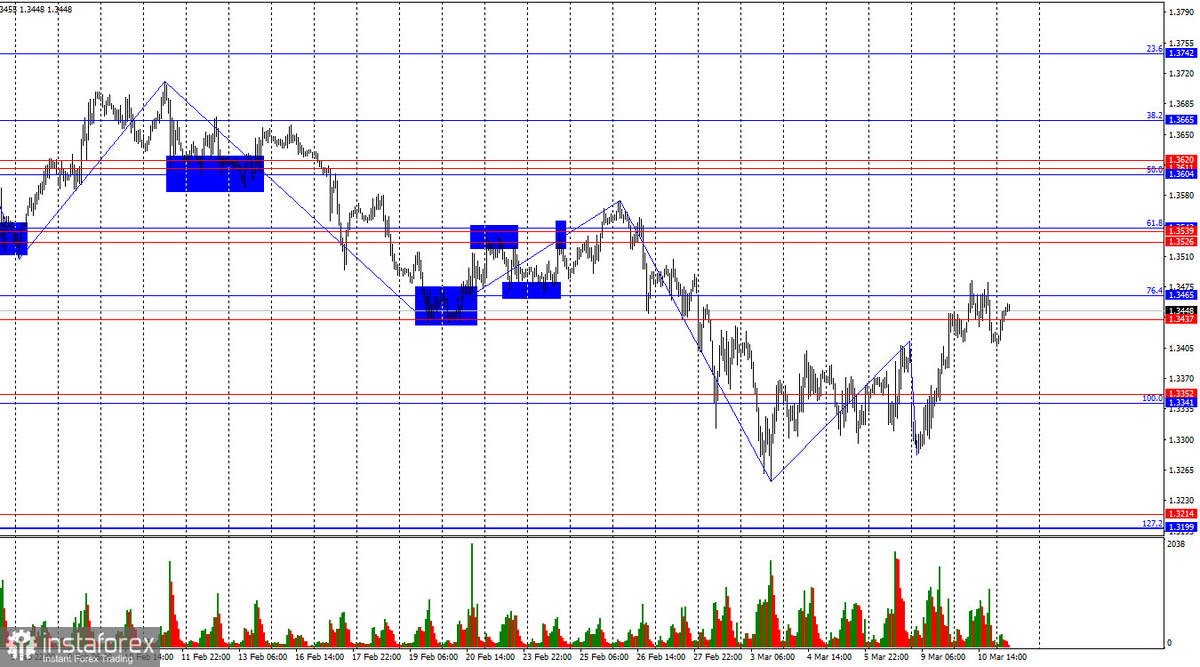 На часовом графике пара GBP/USD во вторник выполнила рост к зоне сопротивления 1,3437–1,3465. Отбой котировок от этой зоны сработает в пользу американской валюты и некоторого падения в направлении зоны поддержки 1,3341–1,3352. Закрепление курса пары над зоной 1,3437–1,3465 повысит вероятность продолжения роста в направлении следующей зоны сопротивления 1,3526–1,3539. Ситуация с волнами продолжает меняться на «бычью». Последняя завершенная волна вниз не пробила предыдущий лоу, а новая волна вверх пробила предыдущий пик. Таким образом, мы начинает наблюдать первые зачатки «бычьего» тренда. Информационный фон для британца был слаб в последние месяцы, а геополитика обеспечивала медведям полное преимущество на рынке. Однако война в Иране может завершиться в скором времени, а Ормузский пролив – разблокирован американскими военными кораблями. Информационный фон во вторник был слаб, но трейдеры-быки продолжали атаковать на фоне снижения напряжения на Ближнем Востоке. Безусловно, говорить о зав