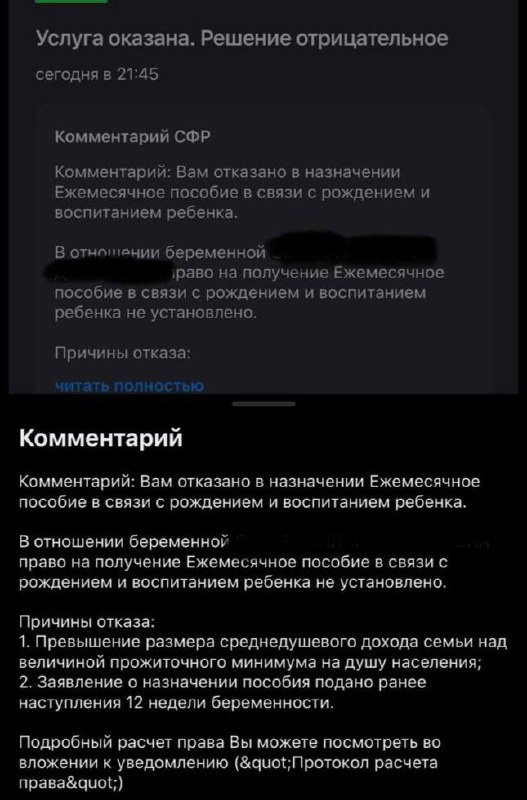Все из-за превышения доходов их семьи величины прожиточного минимума на душу населения и якобы слишком ранним обращением, хотя срок у девушки — больше 14 недель. «Мой муж является участником СВО, мобилизованный. Я беременна, не работаю, учусь на заочной форме обучения, нахожусь на 14-й неделе беременности. Отказали в пособии по беременности в связи с доходом мужа и в связи с моим сроком беременности, якобы он меньше 12 недель», — пожаловалась девушка в Социальный фонд. Она просит разъяснить, какие льготы действуют для беременных жен военнослужащих и почему она не может получить пособие, учитывая, что не работает, а семья не имеет своего жилья. ⭐️ Татарстан News 📲 Татарстан News в MAX