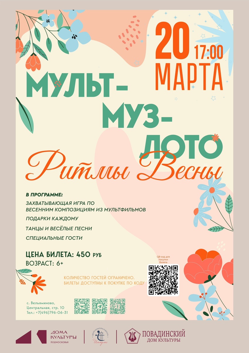 ✨ 🎶Наполните музыкой свой вечер! Совсем скоро в стенах Дома культуры состоится яркое и увлекательное событие для юных гостей — музыкальная игра «Ритмы весны». В формате весёлого лото дети отправятся в мелодичное путешествие, где каждый тур наполнен знакомыми нотами, задорными песнями и весенними мотивами. Участники будут с азартом искать нужные карточки, угадывать мелодии и открывать для себя новые ритмы🎶 🚫 Возраст: 6+ 📆 20.03.2026🕒17:00 🏢 Повадинский сельский дом культуры (СДК) 📍 г.о.Домодедово, с.Вельяминово, 10, Центральная площадь 💰 Цена: 450 ₽ ✅ Мероприятия Домодедово https://dzen.ru/id/66f10385cc4c5a16f7b5fb02 https://vk.ru/domodedovo_events http://dzen.ru/domodedovo_events