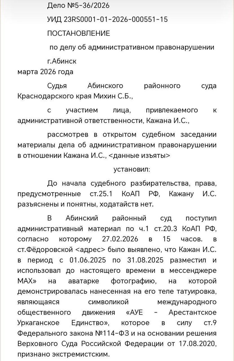 Житель Краснодарского края поставил в профиле свою фотографию, где была видна татуировка восьмиконечной звезды: судьи расценили это как пропаганда запрещенного движения АУЕ Мужчина признал вину — ему назначили штраф в размере 1000 рублей по статье о демонстрации экстремистской символики.