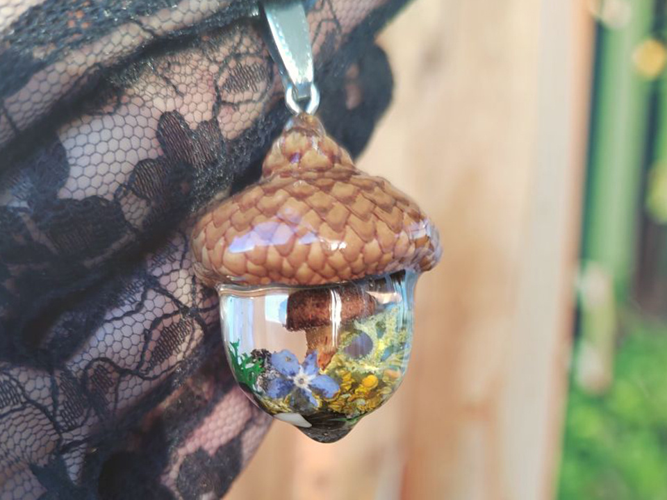 В далёком сказочном лесу, где деревья шептали свои тайны, а цветы сверкали, как звёзды на ночном небе, жил-был маленький гном по имени Флип. Он был мастером по созданию удивительных украшений из смолы. Флип любил собирать в лесу всё самое красивое: яркие лепестки, блестящие камешки и даже капли росы, которые превращались в волшебные бусы и кулоны. Однажды, прогуливаясь по лесу, Флип наткнулся на необычный желудь. Он был не просто желудем - он светился мягким золотистым светом и излучал тепло. Гном понял, что это не обычный желудь, а волшебный. Он аккуратно положил его в свой рюкзак и поспешил домой. Флип решил сделать из этого желудя уникальное украшение. Он смешал смолу с блестящими частичками и аккуратно поместил желудь внутрь. Когда смола застыла, получилось великолепное ожерелье, которое переливалось всеми цветами радуги. Но это было ещё не всё! Как только Флип надел кулон на шею, он почувствовал, как его наполнили силы леса. Вдруг из желудя раздался тихий голос. «Спасибо тебе, д