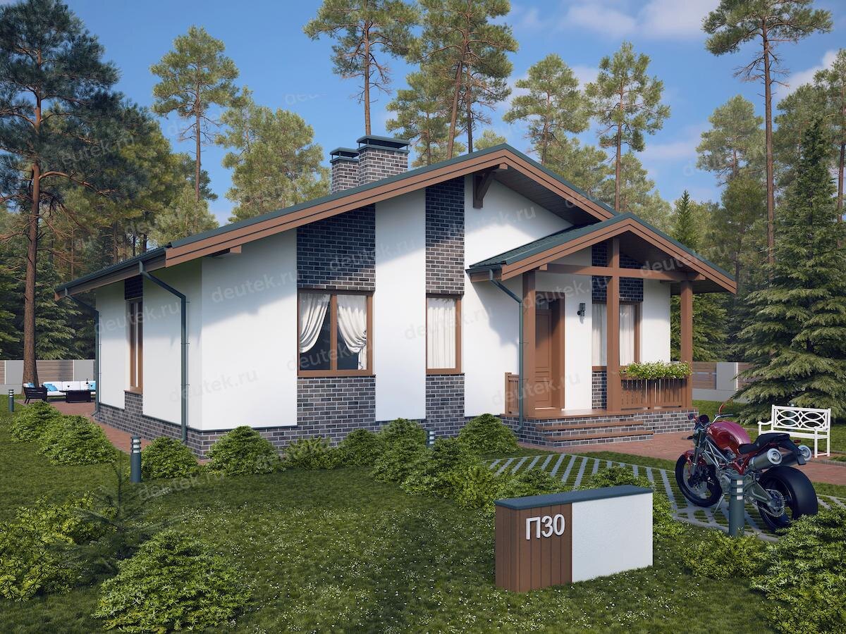 Номер проекта: DTE21 Разделы проекта: Архитектурный и Конструктивный разделы Заказать проект можно на сайте deutek.ru или по телефону +7 (495) 175-30-40 Другие проекты можете посмотреть в этом разделе https://zen.yandex.ru/proektirovaniedomov Представляем одноэтажный дом площадью 112 м2 и габаритами 12.5 x 13.5 м. Проект отличается, с одной стороны, простотой решений, а с другой — необычайной практичностью и функциональностью. Семья из 3-4 человек найдет здесь достаточно места. Помимо уютной гостиной, объединенной кухней-столовой, в распоряжении жильцов: 3 спальни, санузел с душем, котельная с возможностью установки стиральной машины, удобная крытая терраса. Дом начинается тамбуром, откуда есть выход в котельную. Котельную одновременно планируется использовать как прачечную и дополнительный санузел. В передней части г-образного холла установлен шкаф для верхней одежды. Гостиная и кухня-столовая объединены в общую дневную зону, с выходом на террасу из гостиной. В кухне-столовой — углово