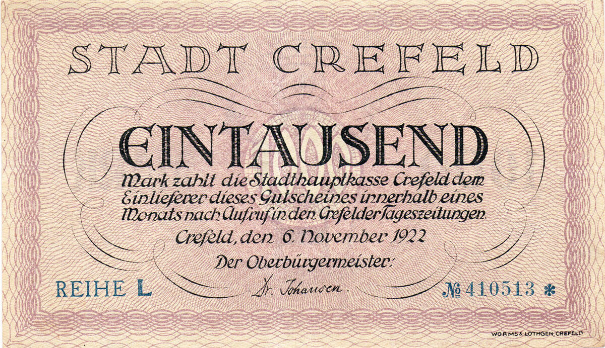 Крефельд (Crefeld) - город в Германии, расположен в земле Северный Рейн-Вестфалия. Подчинён административному округу Дюссельдорф, который известен своей промышленностью и замечательными художественными достижениями. Одна из визитных карточек Крефельда – это его текстильные изделия. Город был известен мировым производством тканей, и по сей день отмечается высоким качеством текстиля и модными брендами. Размер: 158 x 95 мм. Основные цвета розовый и горчичный. В качестве средств защиты водяные знаки в виде линий, по всему полотну банкноты. Лицевая стороны обрамлена рамкой в виде геометрических фигур. В верхней части находится название эмитента - Stadt Crefeld (город Крефельд). Ниже находится рисунок из волнистых линий, внутри которой на фоне цифрового номинала в фигурной рамке "1000", номинал прописью - Eintausend (тысяча). Под ней надпись, в три линии, что "mark zahlt die Stadthauptkasse Crefeld dem Einlieferer dieses Gutscheines innerhalb eines Monats nach Aufrufin den Grefelder Tagesz