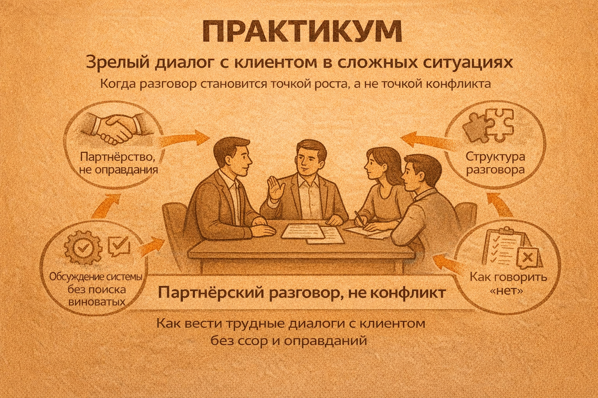 она переводит конфликт в совместное решение. Этот практикум — про то, как это делается управленчески и технологично. Самая распространённая ошибка — воспринимать сложный разговор как суд. Команда думает: Но клиент почти никогда не ищет виноватых.