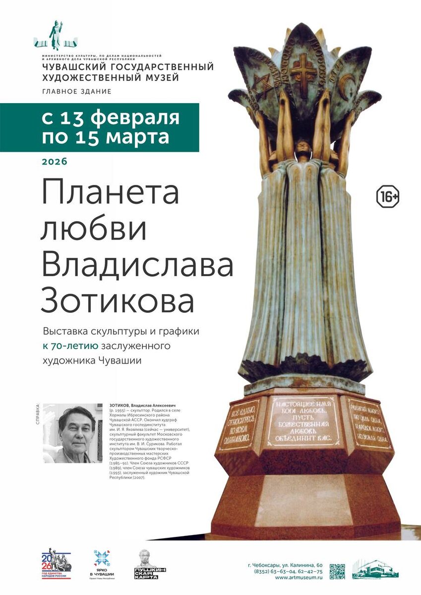 многогранную красоту женского тела. Автор - заслуженный художник Чувашии Владислав Зотиков, которому удается искусно передать в камне изящные изгибы, при этом сохраняя каждую черточку лица. Экспозиция показывает, что женщины прекрасны в любые периоды своей жизни. В залах около 100 произведений. На все это многообразие точно стоит взглянуть своими глазами! Конечно, только в том случае, если вы уже достигли возраста 16 лет. Выставка открыта до 15 марта включительно. Доступна Пушкинская карта нацпроекта «Семья». Билеты - vmuzey.com/event/vystavka-planeta-lyubvi-vladislava-zotikova