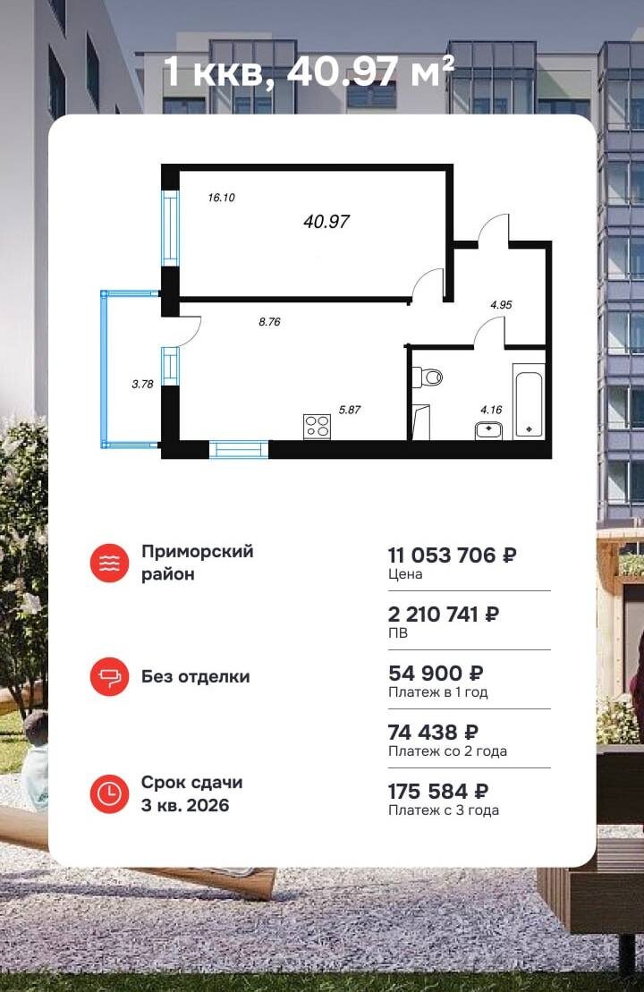 🌳Приморский район Рассрочка на 8 лет — удобное решение для тех, кто хочет заехать в новую квартиру уже сейчас, не дожидаясь завтра. • Первые два года — с пониженными платежами, чтобы ваши клиенты успели обустроиться и насладиться новым домом. • Можно оплатить раньше или перейти на ипотеку — в этом случае мы пересчитаем проценты. • Данная рассрочка совместима с программой Trade in (расскажу) 🏠35,84кв.м. • Цена — 10 203 648 ₽ • ПВ 20% — 2 040 730 ₽ • платеж в 1 год — 54 900 ₽ • платеж во 2 год — 68 276 ₽ • платеж с 3 года — 161 049 ₽ 🏠33,94кв.м. • Цена — 9 988 542 ₽ • ПВ 20% — 1 997 708 ₽ • платеж в 1 год — 54 900 ₽ • платеж во 2 год — 66 716 ₽ • платеж с 3 года — 157 371 ₽ 🏠40,97кв.м. • Цена — 11 053 706 ₽ • ПВ 20% — 2 210 741 ₽ • платеж в 1 год — 54 900 ₽ • платеж во 2 год — 74 438 ₽ • платеж с 3 года — 175 584 ₽