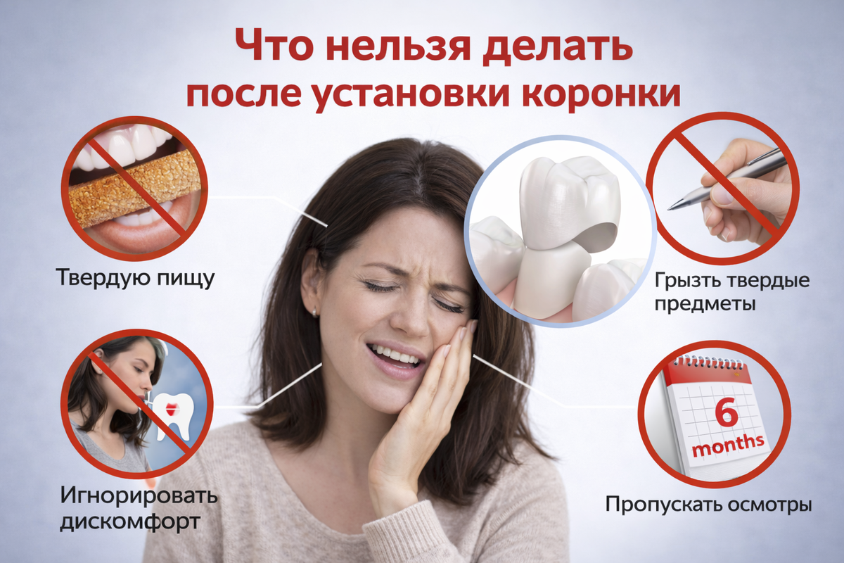 Установка зубной коронки — распространенная стоматологическая процедура, которая позволяет восстановить сильно поврежденный зуб и вернуть ему полноценную функцию. После лечения многие пациенты чувствуют облегчение, но при этом возникает важный вопрос: что нельзя делать после установки коронки, чтобы она прослужила долго? Несмотря на прочность современных материалов, первые дни после установки коронки требуют осторожности. Некоторые привычные действия могут привести к расцементировке, повреждению коронки или даже к проблемам с зубом. Разберёмся подробно, какие ограничения существуют после установки зубной коронки и чего лучше избегать. Одно из главных ограничений — твердая пища в первые часы после установки коронки. Коронка фиксируется на специальный стоматологический цемент. Хотя он начинает затвердевать достаточно быстро, для полного набора прочности требуется время. В первые 24 часа лучше избегать: орехов В этот период лучше выбирать мягкую пищу: После полного затвердевания цемента м