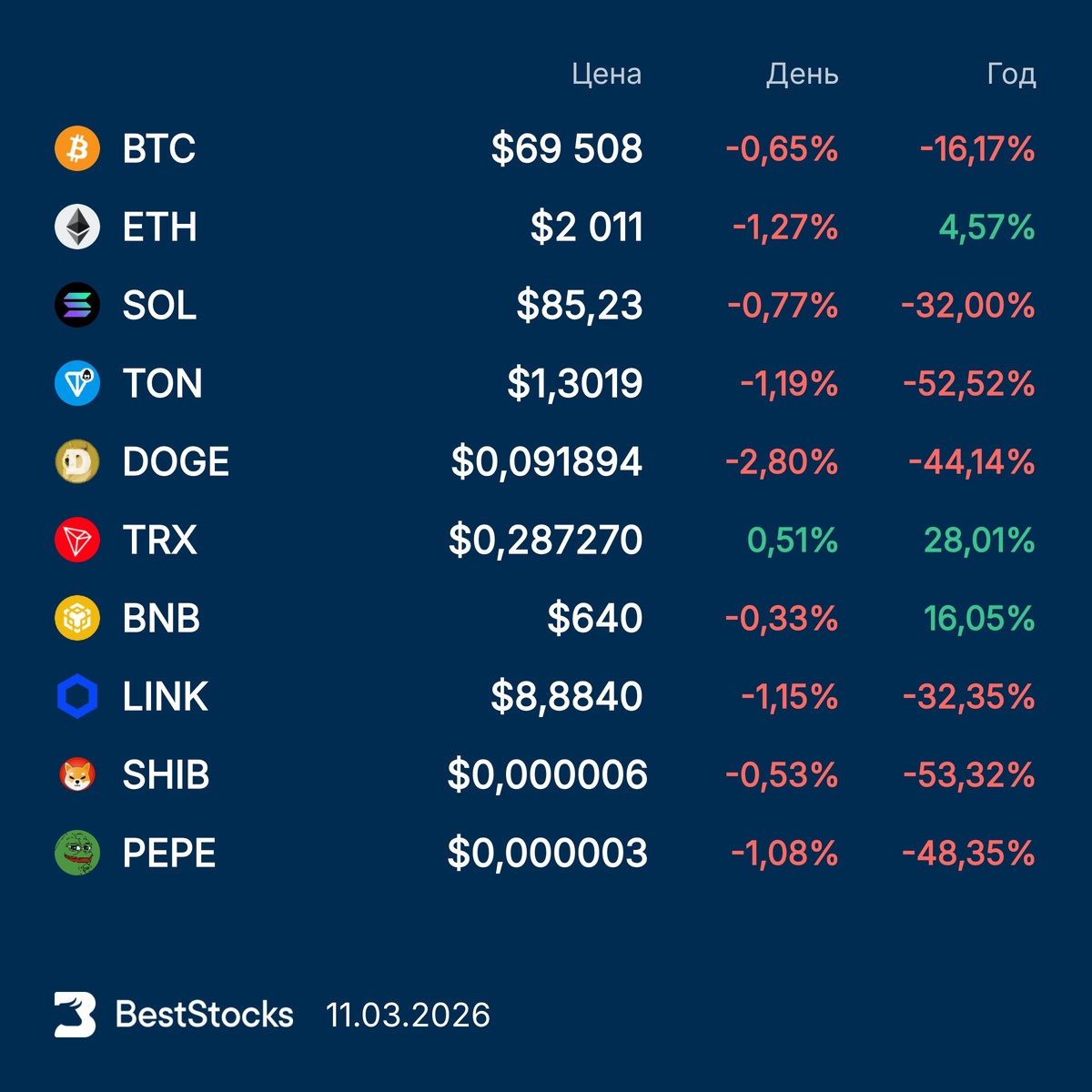 Курсы основных криптовалют: Bitcoin, Etherium, Solana, Toncoin, Dogecoin, TRON, BNB, Chainlink, Pepe, Shiba Inu на текущий момент