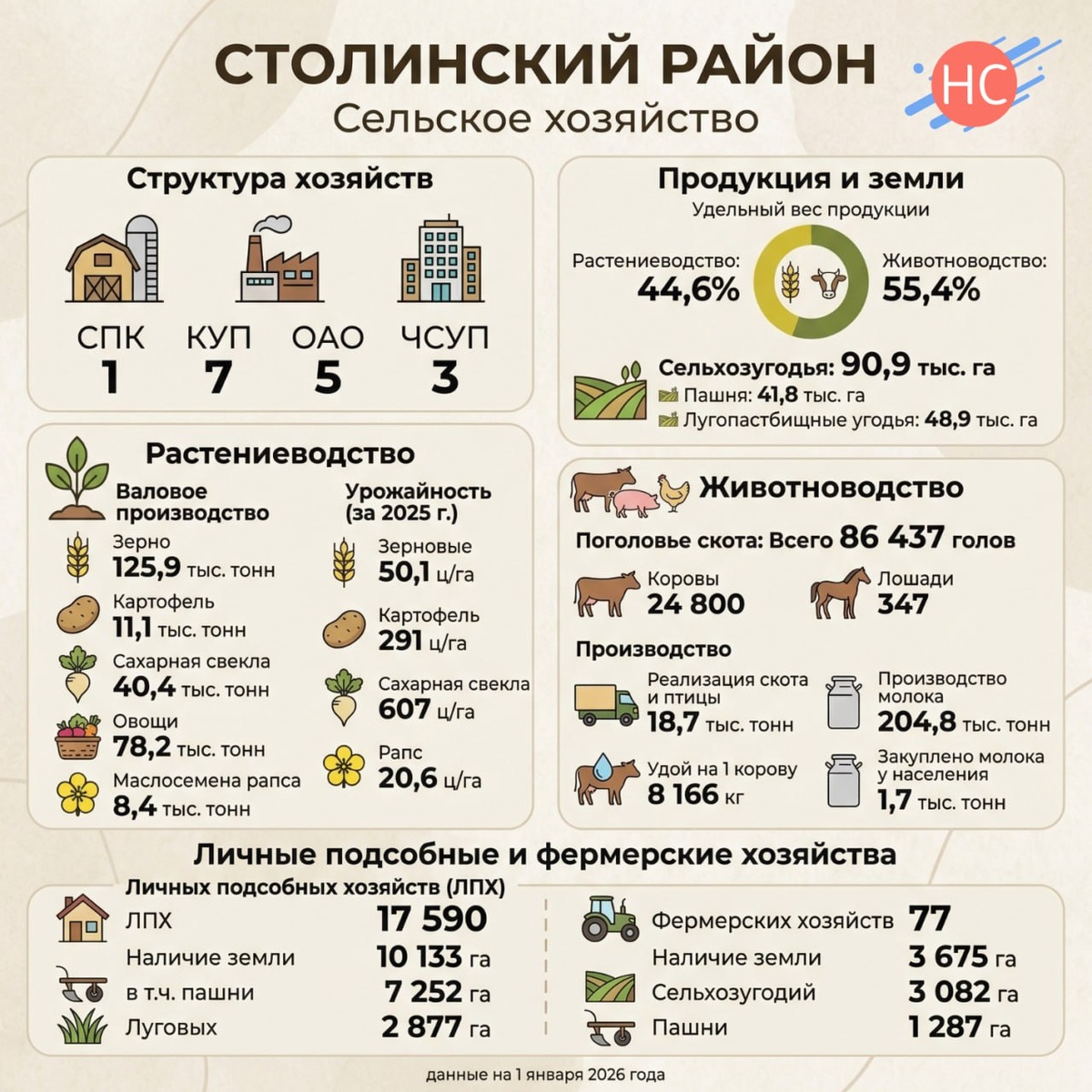 👋 Сегодня выпускаем вторую инфографику из нашей серии. И тема такая, от которой у каждого из нас что-то внутри отзывается теплом. СЕЛЬСКОЕ ХОЗЯЙСТВО 🌾🐄 🌽 Знаете, когда смотришь на эти цифры, понимаешь: Столинщина - это не просто точка на карте. Это огромный живой организм, который кормит, работает, растёт. Взгляните только: 🥛 204 тысячи тонн молока — вы представляете масштаб? 🌽 125 тысяч тонн зерна 🥔 И почти 80 тысяч тонн овощей Рассматривайте инфографику, удивляйтесь. И обязательно ставьте реакции ❤️ Сохраняйте пост, делитесь с друзьями - пусть все знают, чем богата и сильна наша земля. А мы готовим для вас следующий выпуск. Тема уже на подходе 🔥
