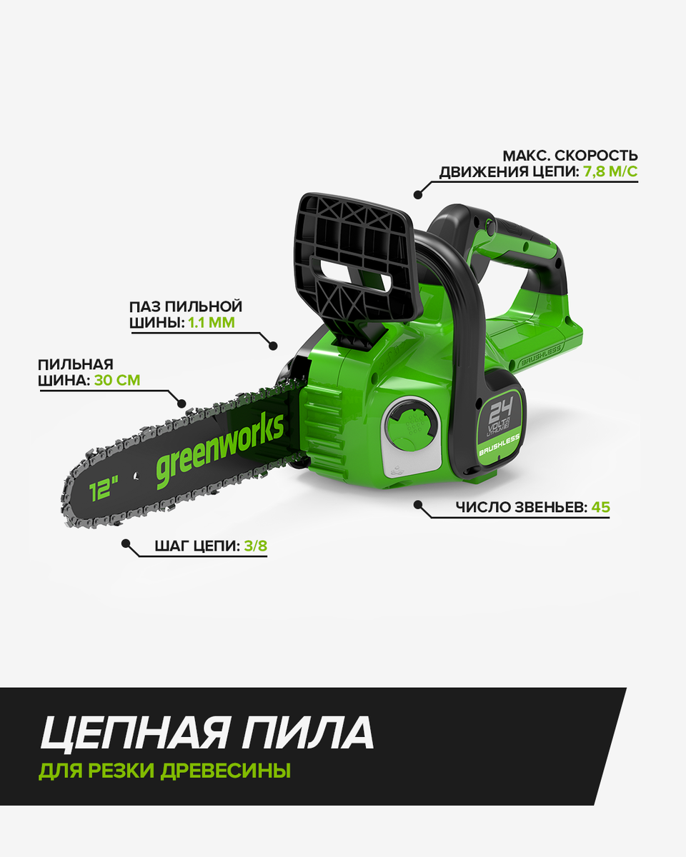 Компактная, сбалансированная и готовая к серьёзной работе: аккумуляторная цепная пила Greenworks GD24CS30, 24V, (2007007)