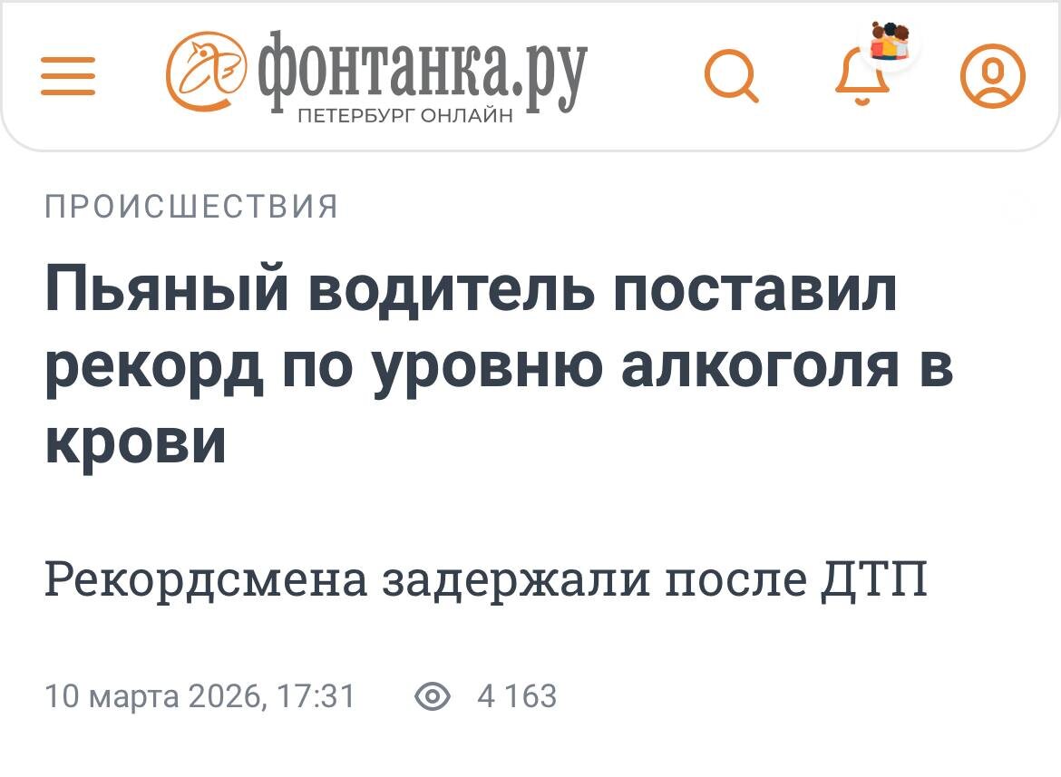 В Иркутске автоинспекторы задержали водителя, виновника ДТП, который еще и скрылся с места аварии. Как вы уже поняли из иллюстрации, водитель оказался не только виновником дтп но и рекордсменом всей страны. Алкотестер показал, что водитель изрядно напился, набрав аж 4 мг/л этанола в выдыхаемом воздухе. Цифра, превосходящая максимально допустимую норму в 28 раз!!! Если перевести в промилле то водитель выдохнул 10 промилле. Напомню, что допустимая максимальная доза равна 0,3 промилле. Да, здесь можно много нравоучений говорить. Алкоголь и автомобиль не дружат, садиться пьяным за руль нельзя. Конечно, водитель не прав. В данном случае 28 раз не прав. Но интересно другое! Максимальная доза алкоголя, совместимая с жизнью (читая - смертельная) составляет 5 промилле. Так что рекордсмен побил и этот рекорд, выдав две смертельные дозы алкоголя. Энтузиасты уже посчитали, что водитель выпил порядка четырех бутылок водки. Если брать более слабый алкоголь, то выйдет еще больше. Но, согласитесь, вря