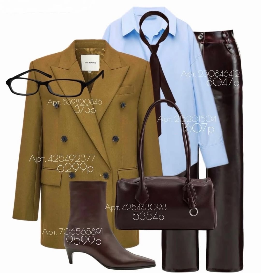 В этой подборке особенно красиво работает контраст. С одной стороны — строгий двубортный жакет с уверенным силуэтом, с другой — расслабленная рубашка в холодном голубом оттенке. Кожаные брюки добавляют характер и остроту, сумка делает образ зрелым и статусным, ботильоны вытягивают силуэт, а узкие очки завершают всю композицию модной, чуть драматичной нотой. Вещи здесь подобраны так, что каждая хороша сама по себе, но вместе они создают цельный и очень сильный образ.