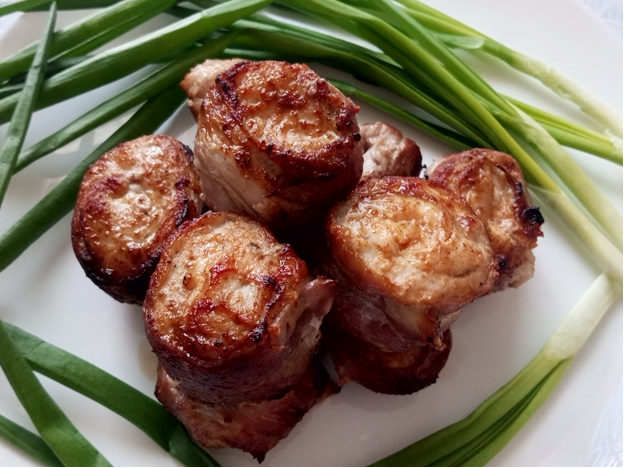 Очень просто и вкусно приготовить, но нужно иметь ввиду, что такой шашлык значительно уменьшится в процессе приготовления. Ингредиенты: - крупная куриная грудка – 1 шт.; - бекон – 1 упаковка 220 гр.; - горчица – примерно 0,5 чайной ложки; - соль – по вкусу; - перец черный молотый – по вкусу; - соль – по вкусу. Куриную грудку промыть, нарезать вдоль на тонкие пласты, 5-6 частей, каждый кусочек смазать горчицей, посолить, поперчить, убрать в холодильник мариноваться на 1,5 часа или дольше. Бекон разложить друг на друга внахлест, посолить, поперчить, распределить промаринованные куриные грудки. Свернуть в рулет. Нарезать на 10-12 частей примерно по 3 сантиметра, нанизать на шампуры. Нанизанные на шампуры рулетики обжаривать на раскаленных углях без огня как обычный шашлык примерно 15-20 минут, время обжаривания зависит от погодных условий, первые 3-5 минут рулетики на шампурах переворачивать часто до образования корочки следя за углями и учитывая то, что жир с бекона может капать и подгор