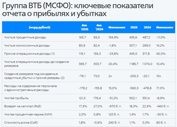 Отчет МСФО за 2025 г. 📉Чистая прибыль = 483,7 млрд руб (-9,6% к прошлому году). 📉Чистые процентные доходы упали на 11% к прошлому году. 📈Чистые комиссионные доходы выросли на 14,2%. 🚩Резервы выросли в 10 раз с 20 до 200 млрд руб. 📉Рентабельность капитала = 18,3%. 🚩Чистая процентная маржа (NIM) = 1,4%. 🚩Стоимость риска (COR) = 1,1%. 📈Капитал = 2,68 трлн руб. 📈Корпоративный кредитный портфель (доля 70%) вырос за год на 4,2%, розничный (доля 30%) снизился на 2,1%. 📈Средства юридических лиц (доля 50%) увеличились на 8,6%, физических (доля 50%) – на 3,8%. 🚩Достаточность капитала Н20.0 = 9,8% при минимуме по требованиям ЦБ РФ = 9,25%. 🟢По анонсированным коэффициентам конвертации префов ВТБ оценен чрезвычайно дешево: 2,3 годовые прибыли и 0,4 капитала. 💸До конца марта банк определится с дивидендами. Диапазон выбора – от 25 до 50% прибыли или от 9,7 до 19,5 руб на акцию. Менеджмент намерен платить больше и для выполнения нормативов продавать кредиты. Правительство оз